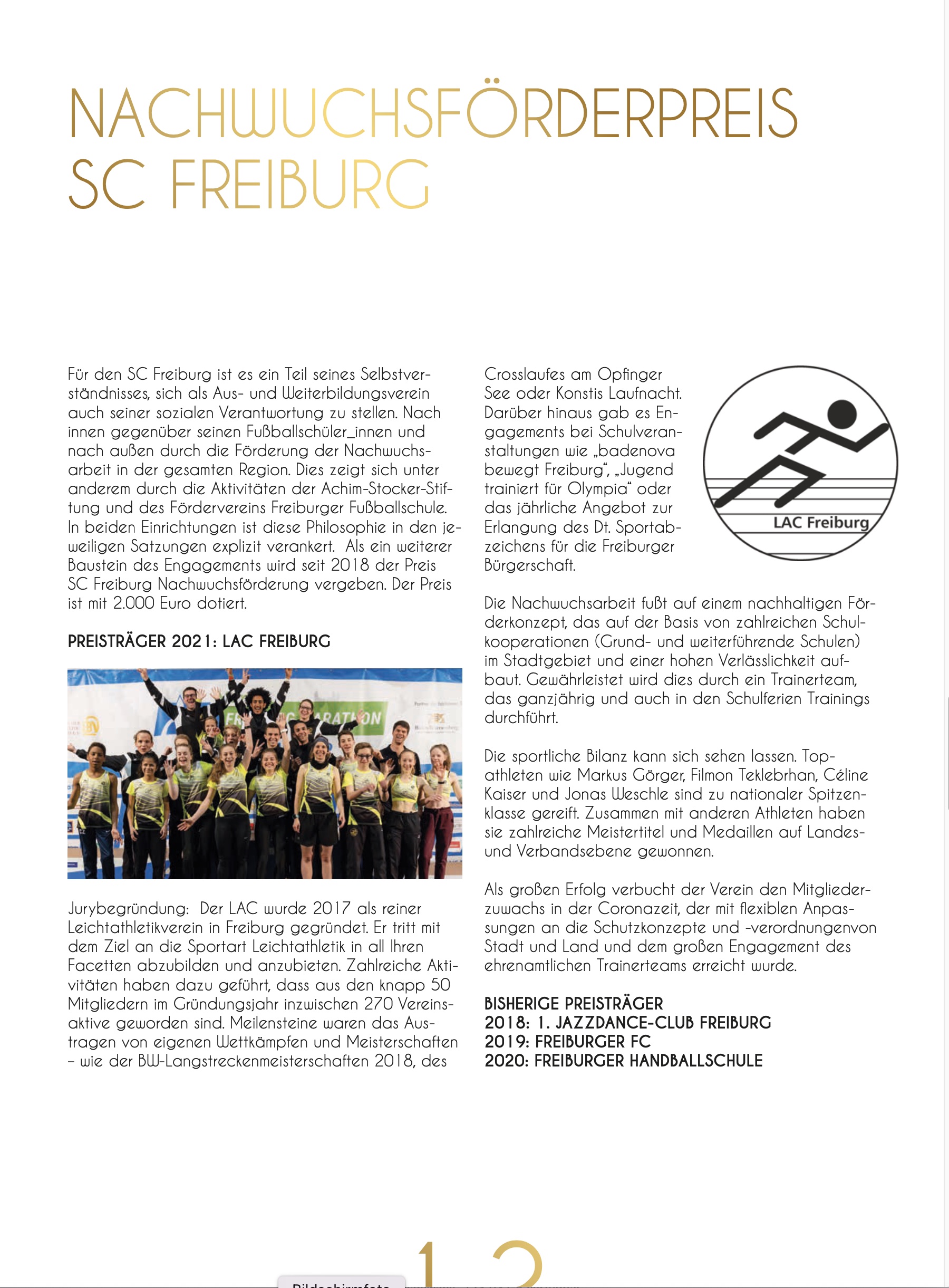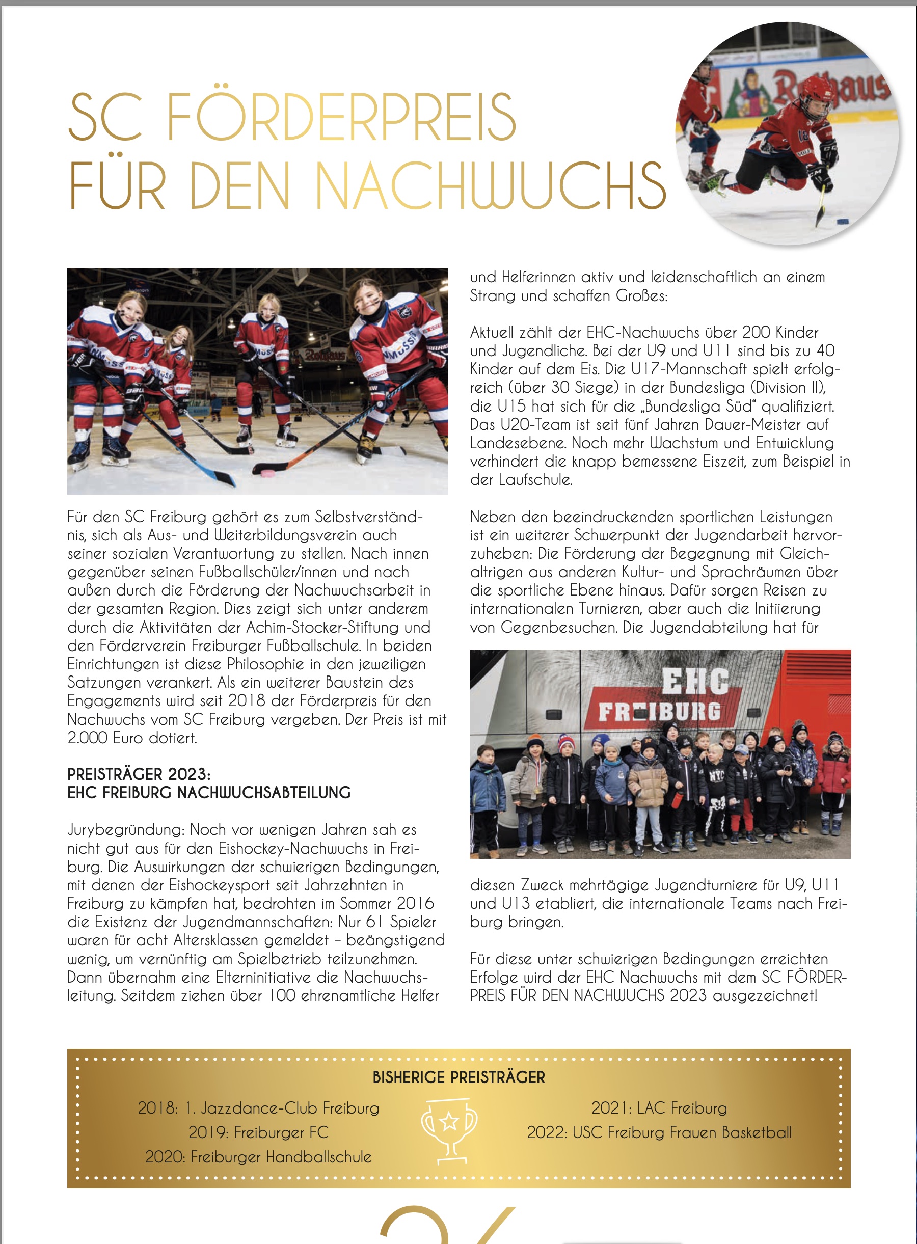 Der Sport Club Freiburg engagiert sich über den Fußball hinaus für Talente im Nachwuchssport. Mit einem Förderpreis ehrt er eine/n Nachwuchssportler/in, der/die sich durch herausragende Leistungen, Unterstützung verdient hat.